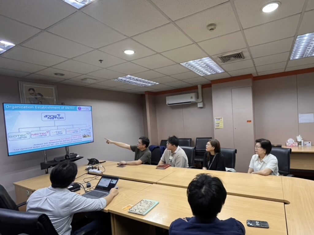 During the visit, Dr. Tawan Champeecharoensuk, a researcher from the Renewable Energy and Energy Efficiency Research Team, along with team members, Ms. Kanokwan Maikaew, Mr. Nayos Sirisoot, and Mr. Pham Dinh Thao, provided an overview of ENTEC’s research and innovations, covering biofuels, renewable energy, and clean energy technologies. The delegates also toured pilot-scale facilities and ENTEC’s key laboratories.