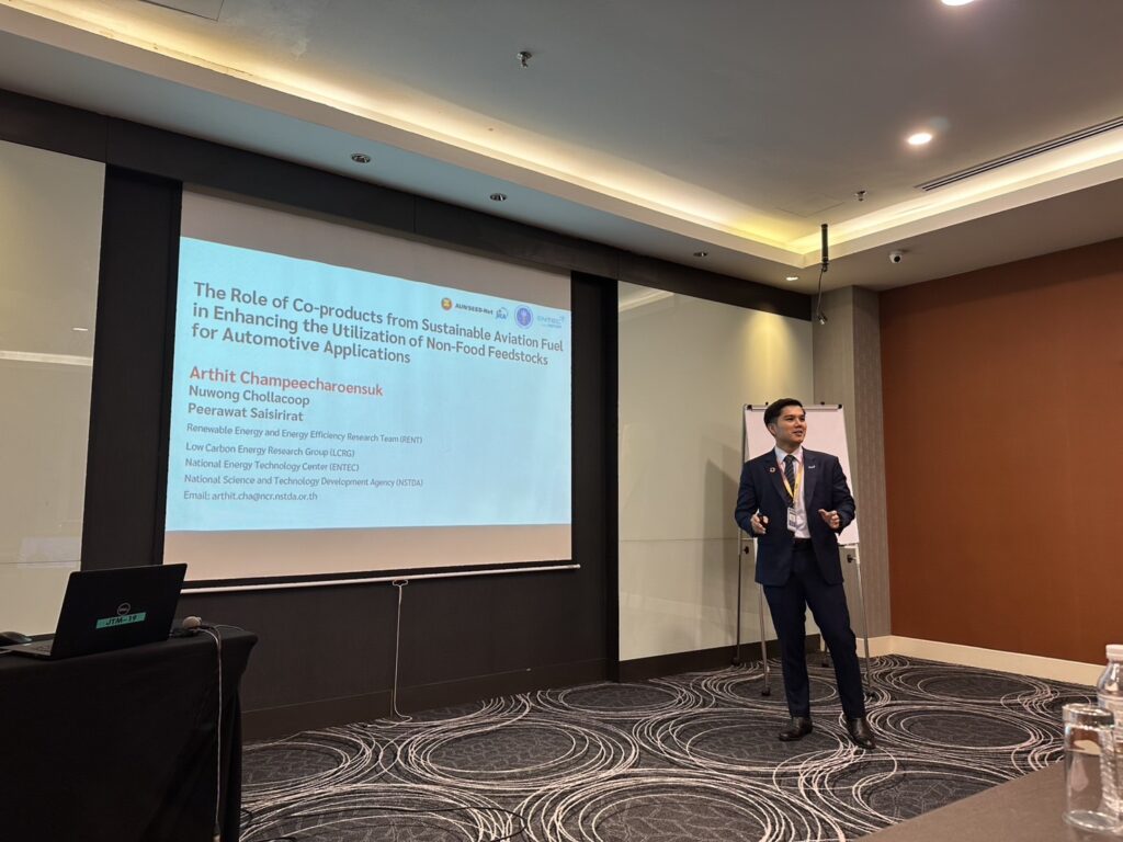 while Dr. Arthit Champijaroensuk presented “The Role of Co-products from Sustainable Aviation Fuel in Enhancing the Utilization of Non-Food Feedstocks for Automotive Applications.” Dr. Tawan Champijaroensuk was honored with the Best Presenter Award for his outstanding presentation.