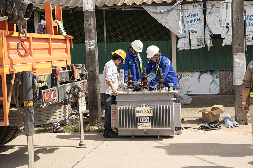 The National Energy Technology Center (ENTEC), under the National Science and Technology Development Agency (NSTDA), in collaboration with the Provincial Electricity Authority (PEA), has broadened the deployment of “EnPAT,” a safe and sustainable product derived from Thai palm oil by installing transformers filled with EnPAT in Na Thung Subdistrict, Mueang Chumphon District, Chumphon Province. The installation was carried out under the supervision of the PEA Chumphon branch, and was honored by the presence of Mr. Patcharat Patcharaweerarat, Deputy Manager (Technical), Acting Manager of the Provincial Electricity Authority, Mueang Chumphon Branch, who oversaw the implementation of this transformer installation.