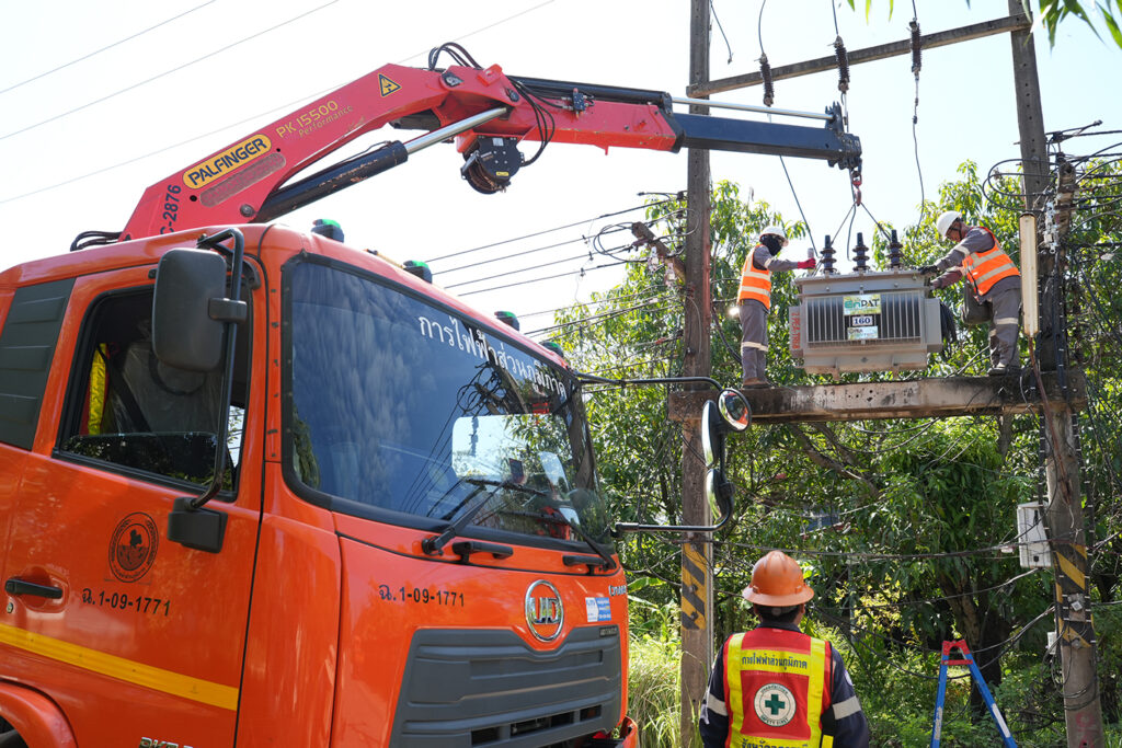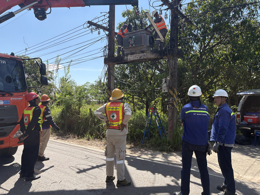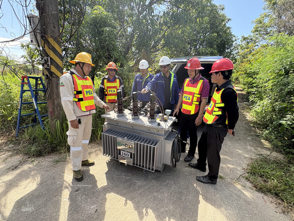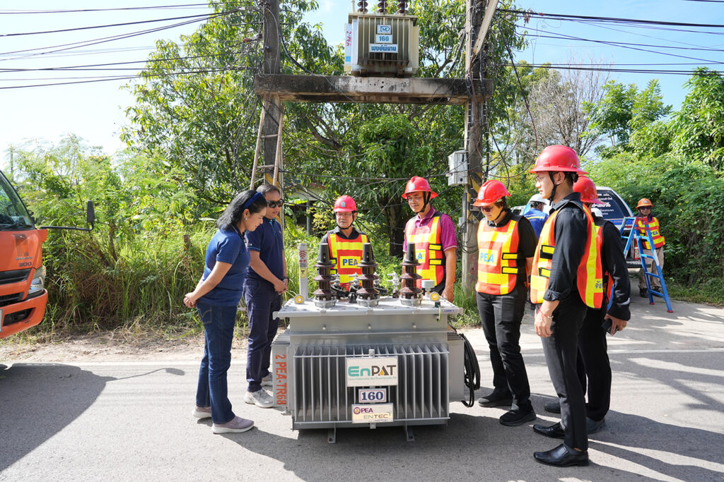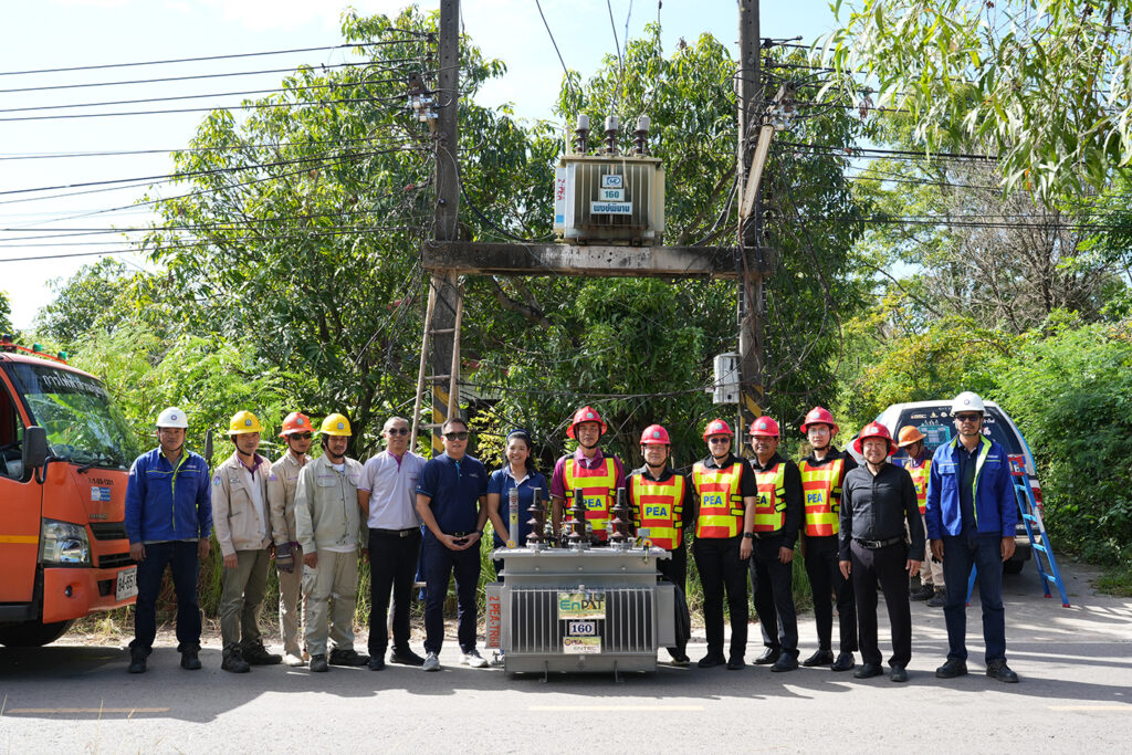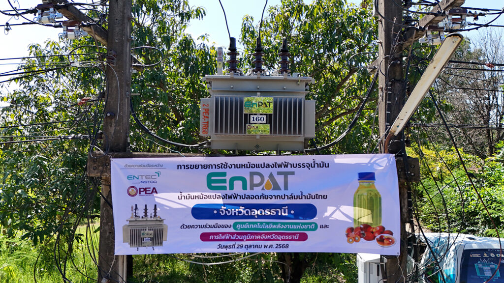 On 29 October 2025, the National Energy Technology Center (ENTEC), National Science and Technology Development Agency (NSTDA), in collaboration with the Provincial Electricity Authority (PEA), advanced the expansion of the deployment of “EnPAT,” a safe, Thai palm-oil-based transformer oil. The initiative involved the installation of an EnPAT-filled transformer in Chiang Phin Subdistrict, Mueang Udon Thani District, Udon Thani Province, under the supervision of PEA of Udon Thani. Mr. Chaloemkiat Klangsawat, Manager of the PEA Udon Thani, had the honor of overseeing the installation of this EnPAT-filled transformer.