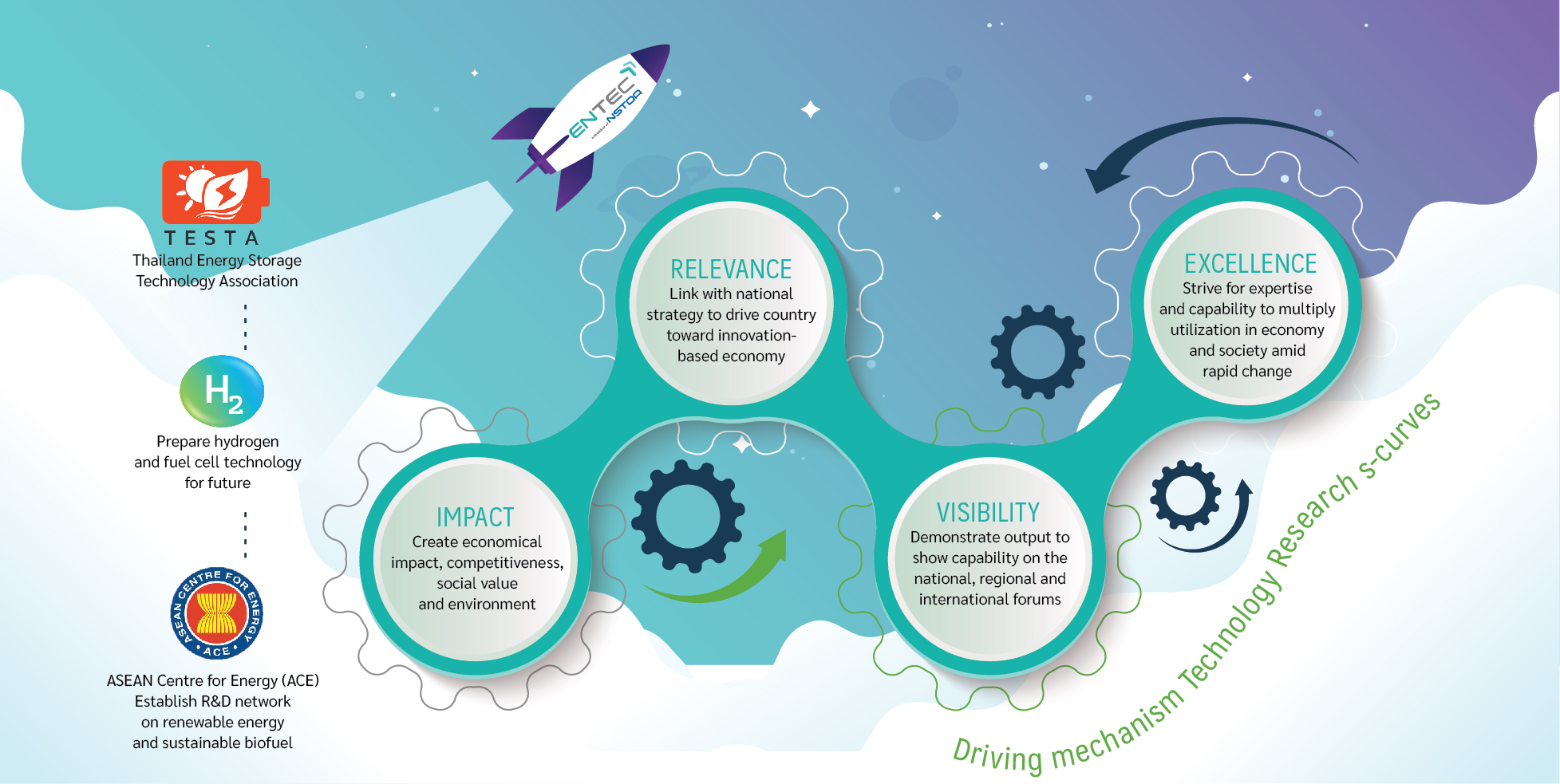 Aim & alignment with NSTDA principles Alignment with relevant policies to drive energy United Nations’ Sustainable Development Goals 20-year Thai National Strategy Bio-Circular-Green Economy 12th National Economic and Social Development Plan Linkage with relevant stakeholdersThailand Energy Storage Technology Association (TESTA)Connect with stakeholders in energy storage technology development and deploymentHydrogen ThailandPrepare hydrogen and fuel cell technology for futureASEAN Centre for Energy (ACE)Establish R&D network on renewable energy and sustainable biofuel