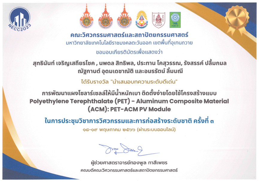 Congratulations to Mr. Suttinan Jaroensathainchok, Acting Sub Lt. Dr. Nopphadol Sitthiphol, Mr. Pratan Kosuwan, Mr. Rangson Pluemkamon, Mr. Nuttakarn Udomdachanut and Dr. Amornrat Limmanee from Solar Photovoltaic Research Team (SPVT) on winning “Excellent Presentation” award for “Development of Easy-Installation Light-Weight Solar Panel of Polyethylene Terephthalate (PET) – Aluminum Composite Material (ACM) Structure: PET-ACM PV Module”