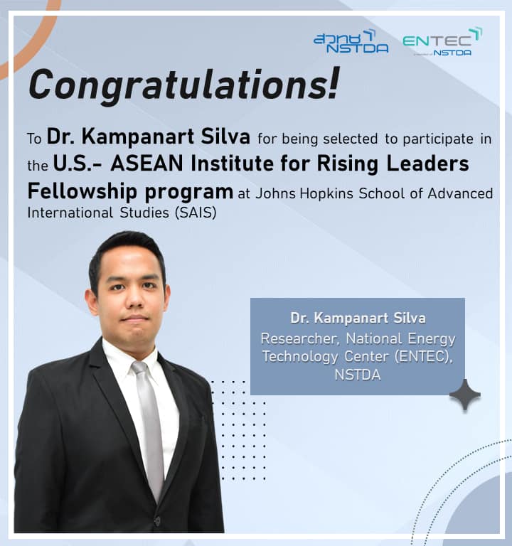 Congratulations to Dr. Kampanart Silva, researcher from Renewable Energy and Energy Efficiency Research Team (RENT), on being selected by the Ministry of Higher Education, Science, Research and Innovation (MHESI) to participate in “U.S. – ASEAN Institute for Rising Leaders Fellowship” at John Hopkins University’s School of Advanced International Studies (SAIS) in Washington D.C., United States