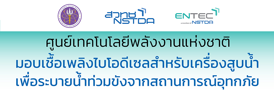 เอ็นเทค สวทช. มอบเชื้อเพลิงไบโอดีเซล B100 ใช้สำหรับเครื่องสูบน้ำเพื่อระบายน้ำท่วมขังจากสถานการณ์อุทกภัย