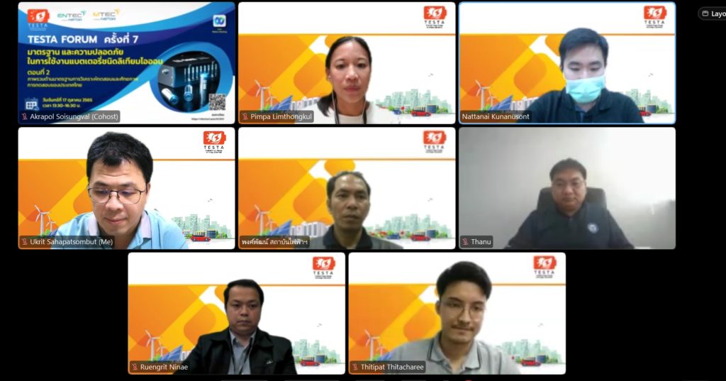 วันที่ 17 ตุลาคม 2565          ศูนย์เทคโนโลยีพลังงานแห่งชาติ (เอ็นเทค) ร่วมกับ ศูนย์เทคโนโลยีโลหะและวัสดุแห่งชาติ (เอ็มเทค) สำนักงานพัฒนาวิทยาศาสตร์และเทคโนโลยีแห่งชาติ (สวทช.) โดยสมาคมเทคโนโลยีระบบกักเก็บพลังงานไทย (TESTA) จัดสัมมนาออนไลน์ TESTA FORUM ครั้งที่ 7 ให้ความรู้เกี่ยวกับมาตรฐาน และความปลอดภัย ในการใช้งาน แบตเตอรี่ชนิดลิเทียมไอออน ตอนที่ 2 ภาพรวมด้านมาตรฐานการวิเคราะห์ทดสอบและศักยภาพการทดสอบของประเทศไทย ซึ่งมีวิทยากรจากหลายหน่วยงานร่วมบรรยายให้ความรู้ และมีหัวข้อที่น่าสนใจประกอบด้วย         – ภาพรวมทางเทคนิคเกี่ยวกับมาตรฐานด้านความปลอดภัยและประสิทธิภาพของแบตเตอรี่ยานยนต์ไฟฟ้าและระบบกักเก็บพลังงานทั้งระบบเซลล์ โมดูล และแพ็กที่เกี่ยวข้องกับมาตรฐานความปลอดภัยและประสิทธิภาพ โดย ดร.อุกฤษฎ์ สหพัฒน์สมบัติ นักวิจัย ศูนย์เทคโนโลยีพลังงานแห่งชาติ (เอ็นเทค)         – ความคืบหน้าด้านมาตรฐานและการให้บริการของการวิเคราะห์ทดสอบแบตเตอรี่ จากหน่วยงานต่างๆ ประกอบด้วย คุณพงศ์พัฒน์ พันธุ์เพียร จากสถาบันไฟฟ้าและอิเล็กทรอนิกส์ (EEI), […]