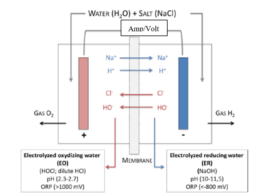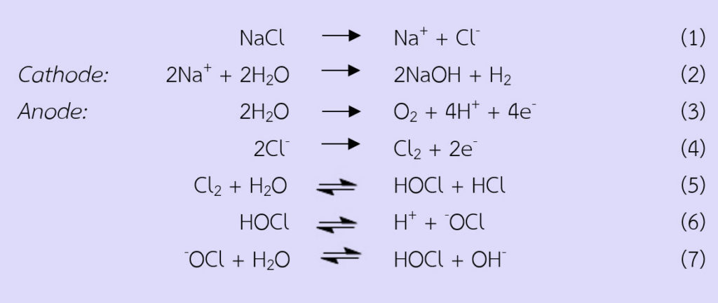 ทีมวิจัยผลิตกรดไฮโปคลอรัสจากสารละลายโซเดียมคลอไรด์ (sodium chloride, NaCl) ด้วยกระบวนการอิเล็กโทรลิซิสและใช้เมมเบรนกั้นกลางระหว่างขั้วแคโทดและแอโนด (ภาพที่ 1) ดร.สมศักดิ์อธิบายว่า “เมื่อจ่ายกระแสไฟฟ้าไปยังขั้วไฟฟ้าบวกและลบ โซเดียมไอออน (Na+) และไฮโดรเจนไอออน (H+) จะเคลื่อนผ่านเมมเบรนไปที่ขั้วแคโทด (ขั้วลบ) โซเดียมไอออนจะรวมตัวกับไฮดรอกไซด์ไอออน (OH) ที่แตกตัวบริเวณขั้วแคโทดกลายเป็นสารละลายโซเดียมไฮดรอกไซด์ (sodium hydroxide, NaOH) ที่มีฤทธิ์เป็นด่าง (pH 10-13, ORP เท่ากับ -800 ถึง -900 mV) (สมการที่ 2) ซึ่งมีสมบัติเป็นสารละลายน้ำรีดิวซ์ (Electrolyzed Reducing Water, ERW) ส่วนไอออนลบ (Cl, OH) จะเคลื่อนผ่านเมมเบรนไปที่ขั้วแอโนด (ขั้วบวก) เกิดก๊าซคลอรีน (Cl2) (สมการที่ 4) ซึ่งก๊าซคลอรีนบางส่วนที่ละลายในน้ำจะเกิดเป็นกรดไฮโปคลอรัส (hypochlorous acid, HOCl) ที่ pH 2-3 (สมการที่ 5) ทำให้สารละลายบริเวณนี้มีสมบัติเป็นสารละลายน้ำออกซิไดซ์ (Electrolyzed Oxidizing Water, EOW)”