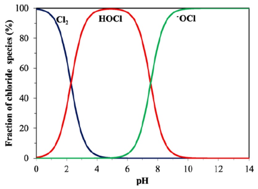 “สารละลายน้ำออกซิไดซ์ที่ได้มีคลอรีนอิสระ (free chlorine) คือมีทั้ง Cl2, HOCl และไฮโปคลอไรต์ไอออน (OCl) ขึ้นอยู่กับ pH ของสารละลาย โดยที่ pH น้อยกว่า 1 คลอรีนอิสระอยู่ในรูป Cl2 ทั้งหมดและจะระเหยสู่บรรยากาศ ที่ pH 1-3.5 คลอรีนอิสระอยู่ในรูป Cl2 และ HOCl ที่ pH 3.5-5.5 คลอรีนอิสระอยู่ในรูปของ HOCl ทั้งหมด ที่ pH 5.5-9 อยู่ในรูป HOCl และ OCl และที่ pH ตั้งแต่ 9 ขึ้นไป คลอรีนอิสระอยู่ในรูปของ OCl ทั้งหมด (ภาพที่ 2)”