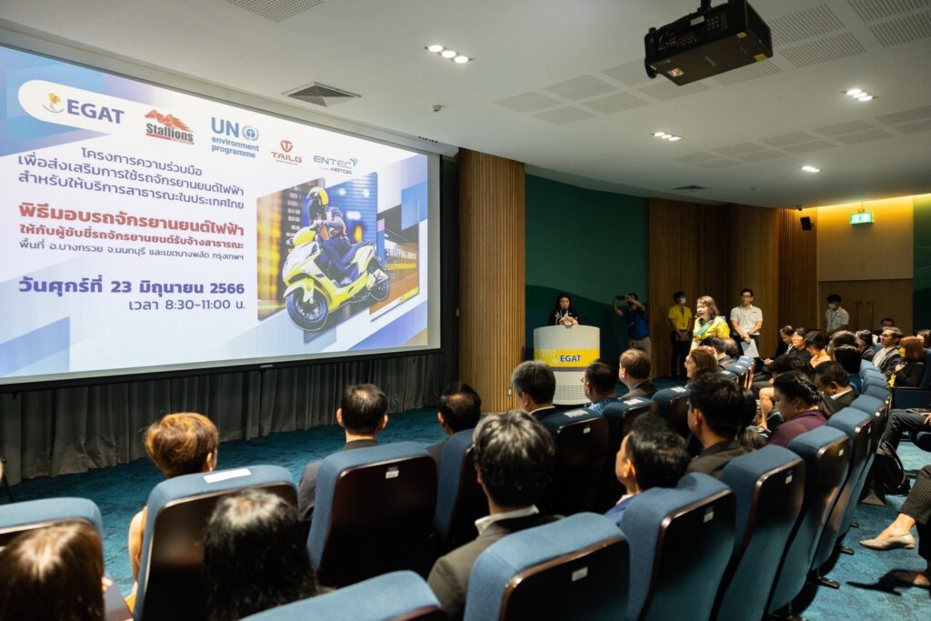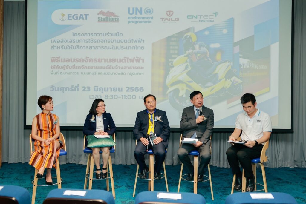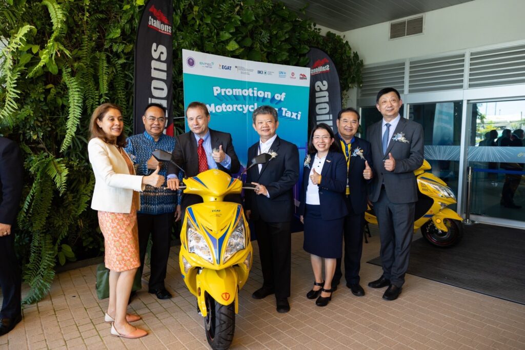 ศูนย์เทคโนโลยีพลังงานแห่งชาติ (ENTEC) สำนักงานพัฒนาวิทยาศาสตร์และเทคโนโลยีแห่งชาติ (สวทช.) นำโดย ดร.สุมิตรา จรสโรจน์กุล ผู้อำนวยการฯ พร้อมด้วย ดร.ลิลี่ เอื้อวิไลจิตร ผู้ช่วยผู้อำนวยการ ดร.นุวงศ์ ชลคุป ผู้อำนวยการกลุ่มวิจัยพลังงานคาร์บอนต่ำ ดร.พิมพา ลิ้มทองกุล ผู้อำนวยการกลุ่มวิจัยนวัตกรรมพลังงาน และคณะนักวิจัย ร่วมกับผู้เเทนจากหน่วยงานที่เกี่ยวข้องจัด “พิธีมอบรถจักรยานยนต์ไฟฟ้าให้กับผู้ขับขี่รถจักรยานยนต์รับจ้างสาธารณะ” ในพื้นที่ อ.บางกรวย จ.นนทบุรี และเขตบางพลัด กรุงเทพมหานคร ซึ่งเป็นกิจกรรมภายใต้โครงการความร่วมมือเพื่อส่งเสริมการใช้รถจักรยานยนต์ไฟฟ้าสําหรับให้บริการสาธารณะในประเทศไทย โดยงานครั้งนี้ได้รับเกียรติจากผู้เเทนในภาคส่วนต่างๆ ที่เกี่ยวข้อง ดังนี้