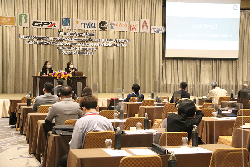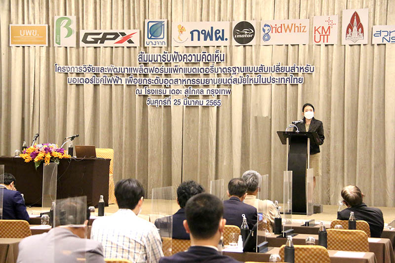 การสัมมนาประชาพิจารครั้งนี้เป็นส่วนหนึ่งของงานในโครงการที่จัดขึ้นเพื่อขอความเห็นที่จะเป็นประโยชน์ในการดำเนินการพัฒนาแพลตฟอร์มแพ็กแบตเตอรี่มาตรฐานแบบสับเปลี่ยนสำหรับรถจักรยานยนต์ไฟฟ้า ทั้งในมุมมองของ ผู้ผลิตรถจักรยานยนต์ไฟฟ้า ผู้ผลิตแบตเตอรี่แพ็กสำหรับรถจักรยานยนต์ไฟฟ้า ผู้ผลิตและให้บริการระบบประจุไฟฟ้าสำหรับรถจักรยานยนต์ไฟฟ้า ผู้ให้บริการด้านการจัดการข้อมูลและพัฒนาแอพพลิเคชั่นการใช้งาน และผู้มีส่วนเกี่ยวข้องในการกำหนดและใช้มาตรฐาน รวมถึงผู้ให้บริการการทดสอบที่เกี่ยวข้องกับแบตเตอรี่แพ็ก และรถจักรยานยนต์ไฟฟ้าของโครงการ โดยข้อมูลที่ได้จากการสัมมนาจะนำไปดำเนินการต่อเป็นต้นแบบแพ็กแบตเตอรี่รถจักรยานยนต์ไฟฟ้าและสถานีสับเปลี่ยนแบตเตอรี่เพื่อศึกษาข้อดี ข้อเสีย และข้อจำกัดต่างๆ เพื่อนำเสนอต่อผู้ที่เกี่ยวข้องด้านการพัฒนามาตรฐานของแพ็กแบตเตอรี่ในประเทศต่อไป