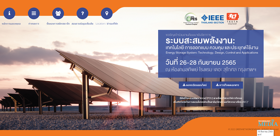 สมาคมไฟฟ้าและพลังงานไอทริปเปิลอี (ประเทศไทย) หรือ IEEE PES-Thailand ร่วมกับสมาคมเทคโนโลยีระบบกักเก็บพลังงานไทย (TESTA) ได้เล็งเห็นถึงความสําคัญ จึงได้จัดให้มีการอบรมเชิงวิชาการเรื่อง ระบบสะสมพลังงาน: เทคโนโลยี การออกแบบ ควบคุม และประยุกต์ใช้งาน ซึ่งจะเป็นประโยชน์อย่างยิ่งต่อการพัฒนาภาคพลังงาน ทั้งการผลิตและการใช้ไฟฟ้าให้ได้รับประโยชน์สูงสุด ในวันที่ 26-28 กันยายน 2565 สามารถดูรายละเอียดเพิ่มเติมได้ที่ http://www.greennetworkseminar.com/ess