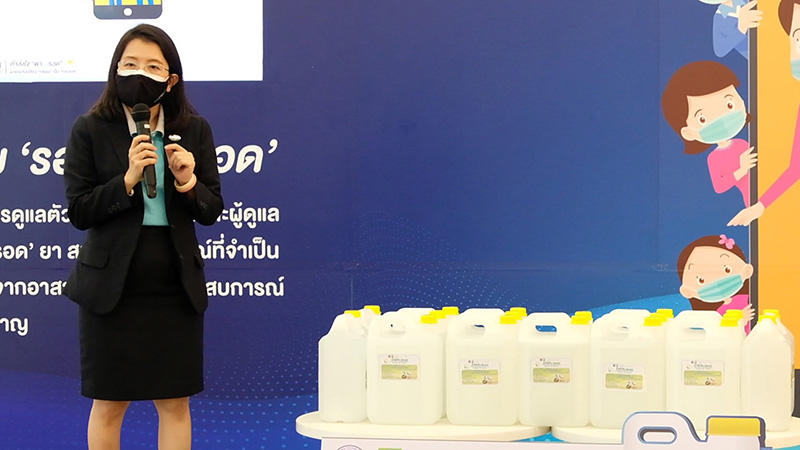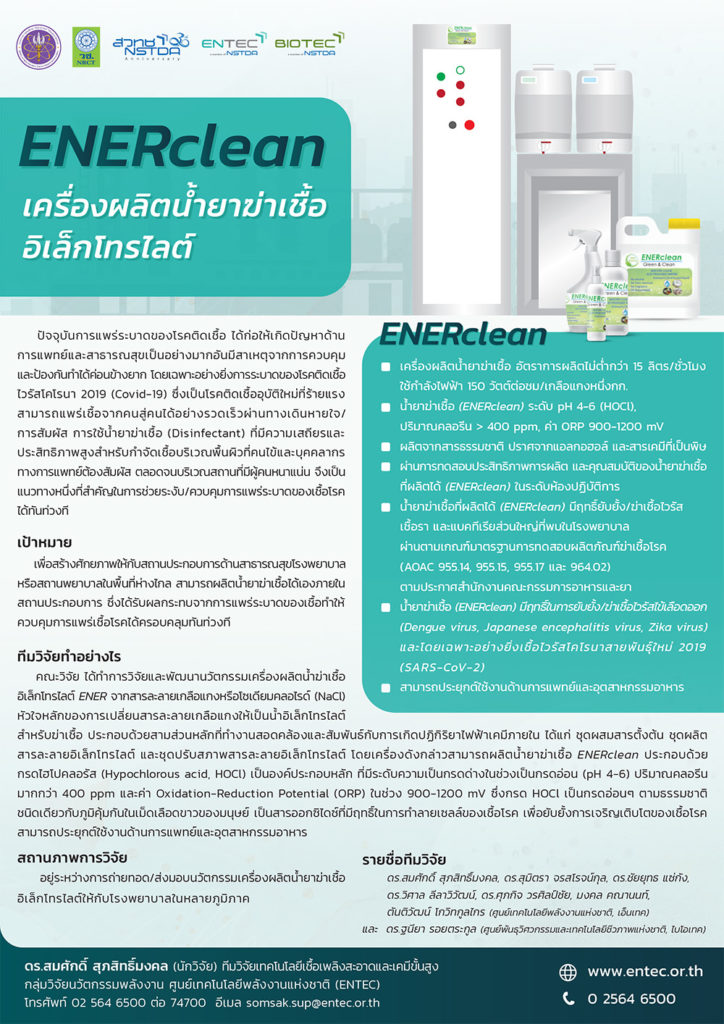 Dr. Sumittra Chairojrochkul, Director of Energy Innovation Research Group of ENTEC, said that “ENERclean” is an innovative product derived from the prototype of a disinfectant generator with electrolyzed water. The ENERclean technology was developed by Dr. Somsak Supasitmongkol, Researcher, and Clean Fuel Technology and Advanced Chemistry Research Team, together with Dr. Thaneeya Roytrakul, Researcher, and Molecular Biology of Dengue and Flaviviruses Research Team, and Dr. Sittiruk Roytrakul, Researcher, and Miss Pattiya Laksanacharoen, Lab Assistant of Functional Proteomic Technology Research Team of the National Center For Genetic Engineering and Biotechnology (BIOTEC). Funding for the project is provided by the National Research Council of Thailand (NRCT) to promote and build capacity for the public health and hospitals in remote areas to be able to produce disinfectant for in-house usage. The disinfectant generator can produce ENERclean that contains hypochlorous acid (HOCI) as the main component with a pH level of pH4-6. The precursors are natural substances with non-alcohol and non-toxic chemicals. ENERclean can be used in the medical and food industry. It efficiently inhibits and kills bacteria, as well as inhabits the Dengue virus, Japanese encephalitis virus, Zika virus, and the Coronavirus 2019 (SARS-CoV-2). ENERclean has passed the tests specified in the standards of disinfecting products (AOAC 955.14, 955.15, 955.17, and 964.02) conforming to the Food and Drug Administration announcement.