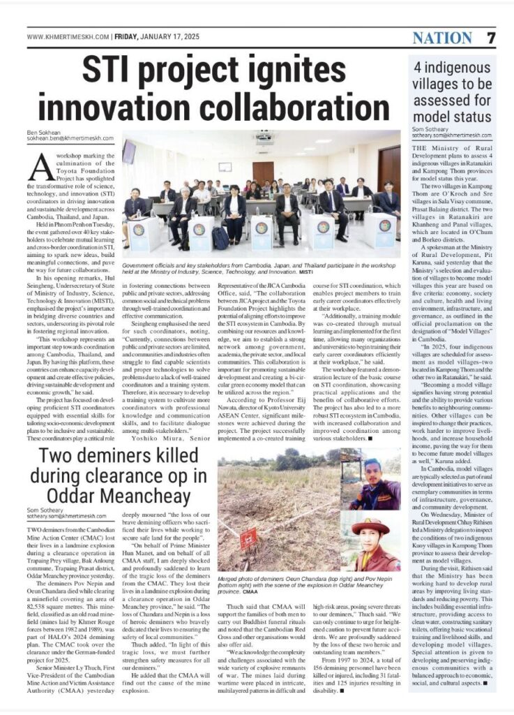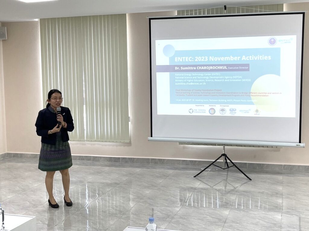 Dr. Sumittra Charojrochkul, Executive Director of ENTEC, National Science and Technology Development Agency (NSTDA), along with Dr. Nuwong Chollacoop, Director of the Low Carbon Energy Research Group, attended the final workshop of Toyota Foundation Project at Cambodia’s Ministry of Industry, Science, Technology & Innovation (MISTI). The workshop aimed to exchange knowledge on “Mutual Learning of Science, Technology, and Innovation Coordination to Bridge Different Countries and Sectors”, within the framework of the Cambodia, Thailand, and Japan Cooperation Program for Capacity Development and Policy Recommendations, which is supported by the Toyota Foundation of Japan.