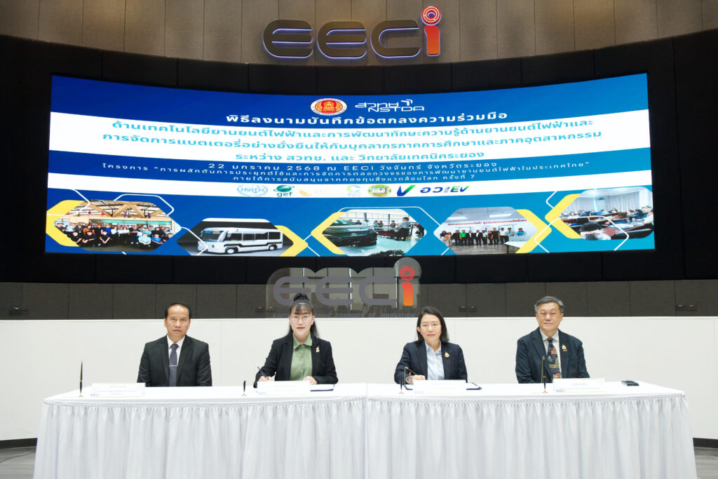 Dr. Sumittra Charojrochkul, Executive Director of the National Energy Technology Center (ENTEC) and Director of the Thailand Electric Vehicle Center of Excellence (TECE), National Science and Technology Development Agency (NSTDA), signed a Memorandum of Understanding (MOU) on “Research and Development of Electric Vehicle Technologies, EV Skills Development, and Sustainable Battery Management” with Rayong Technical College.