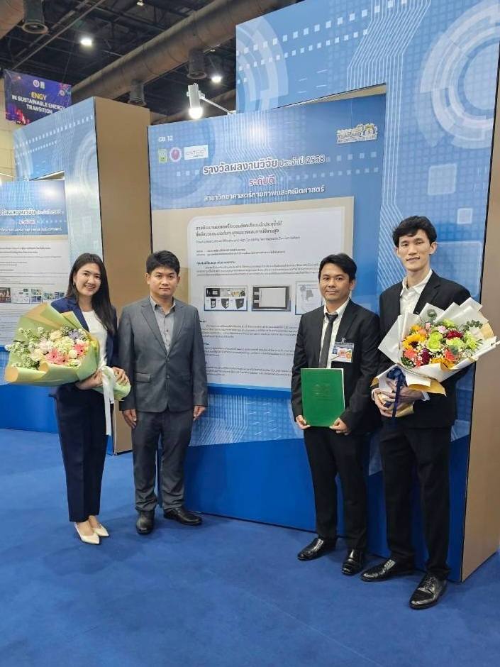 The research project entitled “Development of Rechargeable Zinc-Ion Batteries with High Performance-to-Cost Ratio and Cycle Life” by the Energy Storage Technology Research Team, Energy Innovation Research Group at ENTEC, was honored with the “Good Research Award” in the Physical Sciences and Mathematics field. The research team consists of Dr. Chakrit Sriprachuabwong, Dr. Chatwarin Poochai, Mr. Jaruwit Lohitkarn, and Miss Nattida Maeboonruan, in collaboration with Dr. Adisorn Tuantranont, Vice President of NSTDA, and Dr. Pornanong Pongpaibool, Wireless and Intelligent System Research Team Leader at NECTEC.