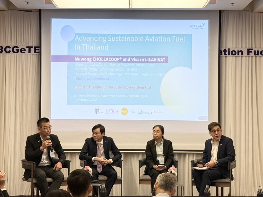 Dr. Nuwong Chollacoop, Director of the Low Carbon Energy Research Group at the National Energy Technology Center (ENTEC), participated in the “BCGeTEC Symposium on Sustainable Aviation Fuel.” The event was organized by the Bio-Circular-Green-economy Technology & Engineering Center, Department of Chemical Engineering, Chulalongkorn University.