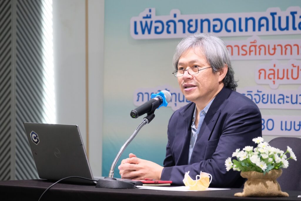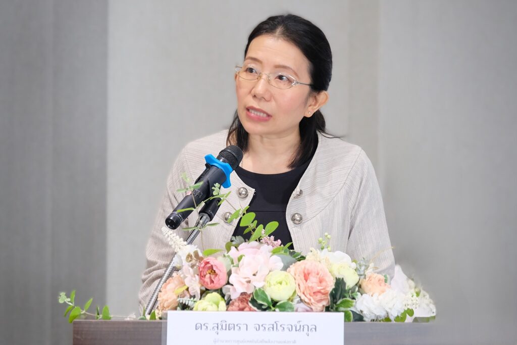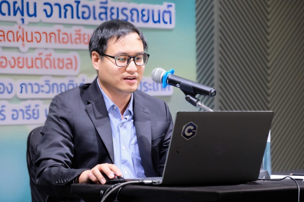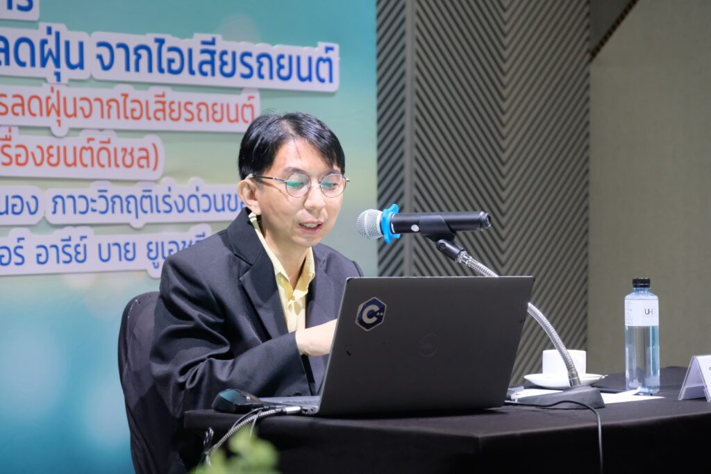 Dr. Supat Wangwongwatana, Director, Hub of Talents on Air Pollution and Climate – HTAPC, NRCT, stated that tackling PM2.5 pollution is a major challenge for government policymakers. It requires proactive policies and measures to prevent and mitigate the impacts on public health. NRCT supports the use of technology and innovation in addressing PM2.5 issues under the P24 program, which aims to respond to urgent national crises. This includes integrated research and innovation support tailored to major emission sources in different target areas, such as agriculture, forestry, transportation, transboundary pollution, and integrated data systems. In the transportation sector, the urgent focus is on Bangkok and its metropolitan region, where traffic congestion is high. A key strategy is to use technology and innovation to reduce emissions from road transport by developing systems to screen and monitor high-emission vehicles and designing management models tailored to the local PM2.5 levels. Dr. Supat expressed his hope that the project’s outcomes would be implemented by relevant agencies and contribute to the development of more effective legislation and enforcement measures.