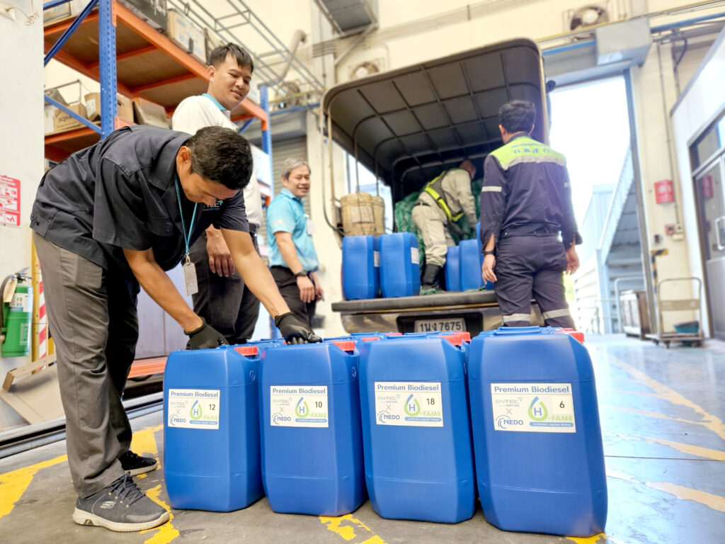 On November 20, 2024, Low Carbon Energy Research Group under National Energy Technology Center delivered 500 liters of Premium Bio Diesel (H-FAME), produced under the project “Demonstration for 100% Biodiesel Fuel Stable Supply and Field Utilization Test in Thailand” to HIDAKA YOOKOO ENTERPRISES CO., LTD. This Premium Bio Diesel (H-FAME) 100% will be tested with the company’s forklifts. The field utilization data from this testing will help build confidence in using Premium Bio Diesel (H-FAME) 100% as a carbon-neutral fuel, contributing to carbon emission reduction for the company and interested users, aligning with efforts to mitigate global warming.