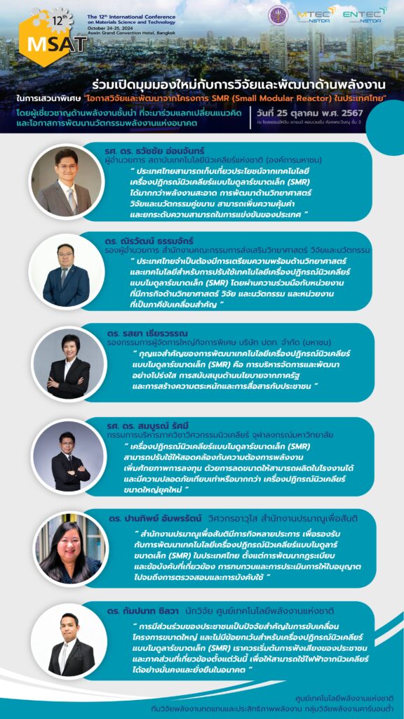 On October 25, 2024, at the Asawin Grand Convention Hotel in Bangkok, the National Energy Technology Center (ENTEC), in partnership with the National Metal and Materials Technology Center (MTEC) under the National Science and Technology Development Agency (NSTDA), organized a seminar titled “R&D Opportunities from SMR (Small Modular Reactor) Program in Thailand” during the 12th International Conference on Materials Science and Technology (MSAT-12).
