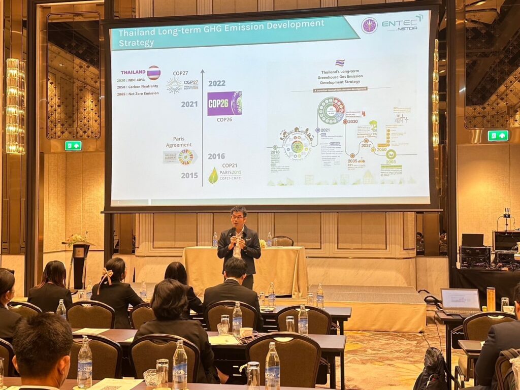 Dr. Visarn Lilavivat, a researcher with ENTEC’s Low Carbon Research Group, presented on “Lesson Learnt and Best Practice of SAF in the Aviation Sector and effects of international and regional regulations on SAF adoption in Thailand”, and Dr. Tawan Champeecharoensuk serving as the main MC at the event.