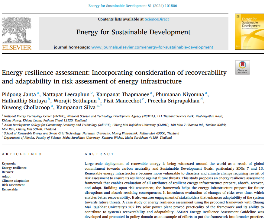 [1] Janta, P., Leeraphun, N., Thapmanee, K., Niyomna, P., Sintuya, H., Setthapun, W., Maneechot, P., Sriprapakhan, P., Chollacoop, N., & Silva, K. (2024). Energy resilience assessment: Incorporating consideration of recoverability and adaptability in risk assessment of energy infrastructure. Energy for Sustainable Development, 81, 101506. https://doi.org/10.1016/j.esd.2024.101506