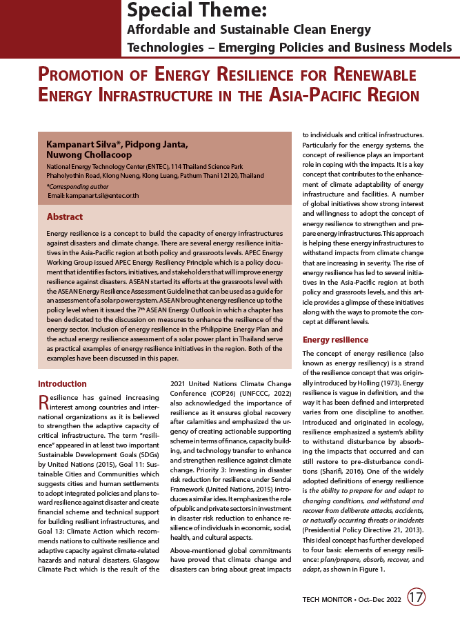 [2] Silva, K., Janta, P., & Chollacoop, N. (2022). Promotion of Energy Resilience for Renewable Energy Infrastructure in the Asia-Pacific Region. Asia-Pacific Tech Monitor: Affordable and Sustainable Clean Energy Technologies, 39(4). https://hdl.handle.net/20.500.12870/5431