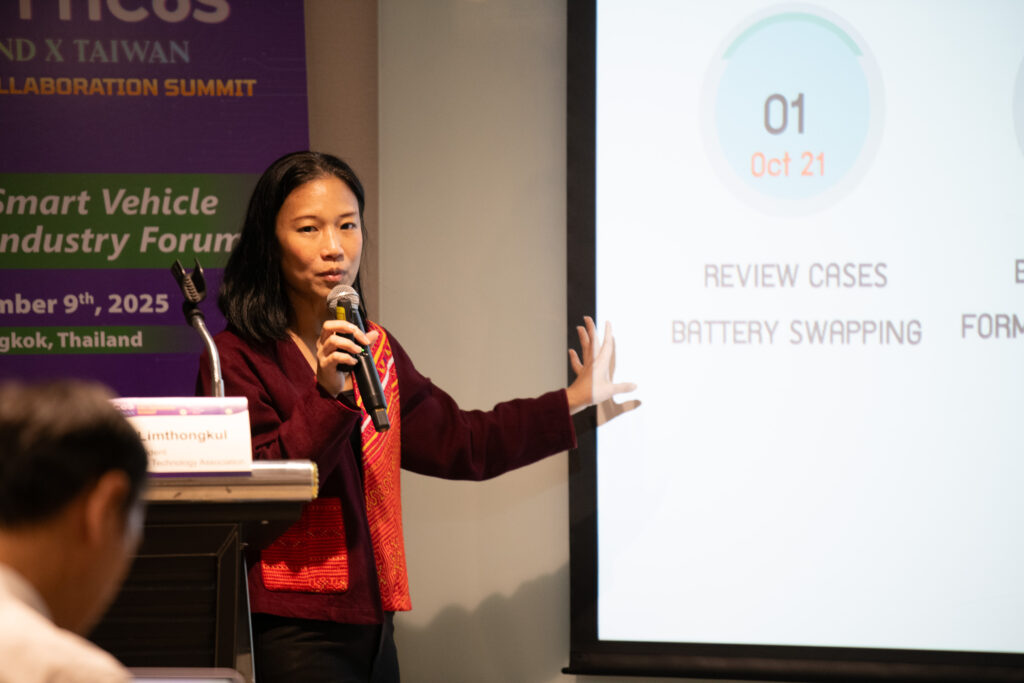 ศูนย์เทคโนโลยีพลังงานแห่งชาติ (ENTEC) สำนักงานพัฒนาวิทยาศาสตร์และเทคโนโลยีแห่งชาติ (สวทช.) นำเสนอแพลตฟอร์มแบตเตอรี่แบบสับเปลี่ยนสำหรับยานยนต์ไฟฟ้าขนาดเล็ก ภายใต้การดำเนินงานภาคีเครือข่ายความร่วมมือการพัฒนาอุตสาหกรรมแบตเตอรี่มาตรฐานแบบสับเปลี่ยนได้สำหรับยานยนต์ไฟฟ้าขนาดเล็ก โดย ดร.พิมพา ลิ้มทองกุล ผู้อำนวยการกลุ่มวิจัยนวัตกรรมพลังงาน ในการประชุมความร่วมมืออุตสาหกรรม ไทย-ไต้หวัน (Thailand–Taiwan Industrial Collaboration Summit TTICoS) ภายใต้หัวข้อสัมมนาเรื่อง Smart Vehicle Industry Forum