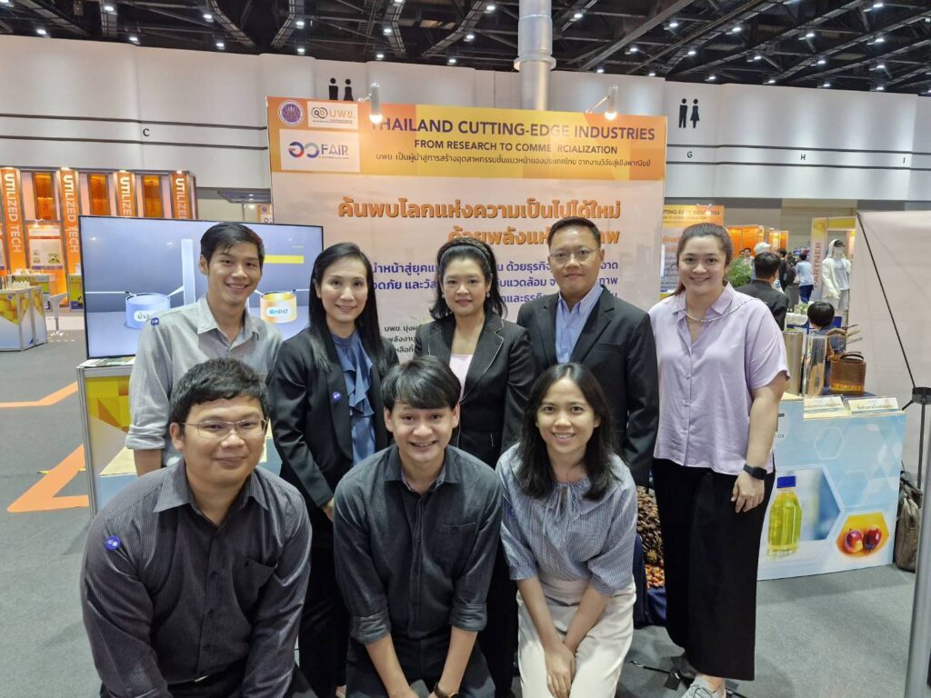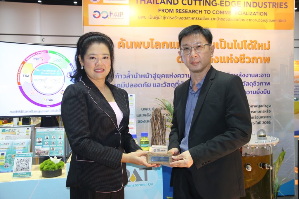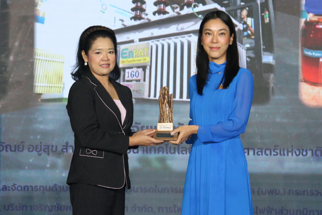 ดร.บุญญาวัณย์ อยู่สุข หัวหน้าทีมวิจัยเชื้อเพลิงสะอาดและเคมีขั้นสูง ศูนย์เทคโนโลยีพลังงานแห่งชาติ เป็นตัวแทนคณะวิจัย เข้ารับรางวัล “PMUC Country First Award ครั้งแรกของไทย งานวิจัยเปลี่ยนประเทศ” ภายในงาน อว.แฟร์ : SCI POWER FOR FUTURE THAILAND มหกรรมส่งเสริมการใช้ประโยชน์ อววน. เพื่อการพัฒนาเศรษฐกิจไทยอย่างยั่งยืน ด้วยพลังสหวิทยาการ โดย น.ส.สุชาดา แทนทรัพย์ เลขานุการรัฐมนตรีว่าการกระทรวงการอุดมศึกษา วิทยาศาสตร์ วิจัยและนวัตกรรม (อว.) เป็นผู้มอบรางวัล จากผลงานวิจัย “EnPAT: น้ำมันหม้อแปลงไฟฟ้าปลอดภัย จากปาล์มน้ำมันไทย” ทั้งนี้ รางวัล “PMUC Country First Award ครั้งแรกของไทย งานวิจัยเปลี่ยนประเทศ” มอบให้สำหรับงานวิจัยที่ได้รับทุนจาก บพข. และเป็นงานวิจัยที่เกิดขึ้นครั้งแรกของประเทศไทย ซึ่งมี impact ต่อการพัฒนาเศรษฐกิจของประเทศ