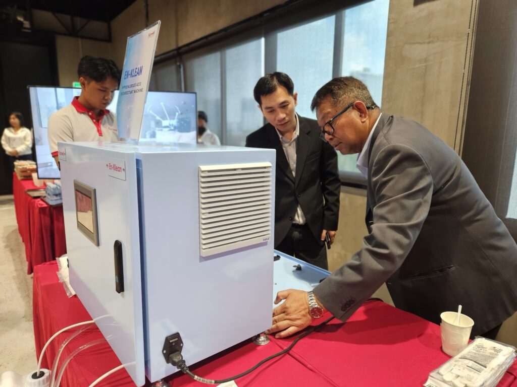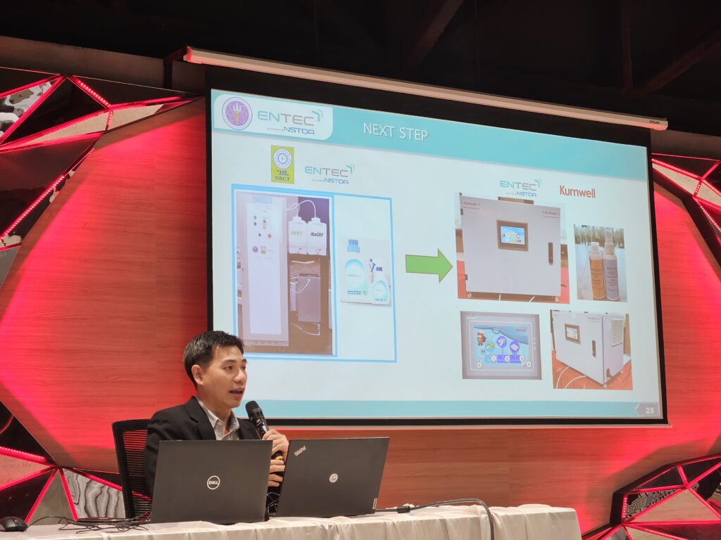 ดร.สมศักดิ์ สุภสิทธิ์มงคล นักวิจัย ทีมวิจัยเทคโนโลยีเชื้อเพลิงสะอาดและเคมีขั้นสูง ร่วมบรรยายแลกเปลี่ยนข้อคิดเห็น เรื่องการคัดกรองเชื้อไม่พึงประสงค์ ด้วยเทคโนโลยีเครื่องผลิตน้ำยาฆ่าเชื้อไฮโปคลอรัสด้วยกรรมวิธีอิเล็กโทรไลซิส ในงานประชุมเชิงปฏิบัติการต้นแบบการประยุกต์ใช้เทคโนโลยีดิจิทัลเพื่อกำกับทิศทางกลุ่มบริการสุขภาพ (รพ.) เพื่อความมั่นคงปลอดภัยด้านพลังงานไฟฟ้า โดยใช้ AI ในการเก็บรักษาข้อมูลชั้นความลับสู่การบริการที่สร้างมูลค่าและเป็นเลิศ