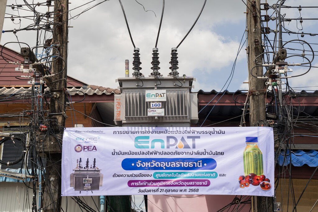 On 21 October 2025, the National Energy Technology Center (ENTEC), National Science and Technology Development Agency (NSTDA), in collaboration with the Provincial Electricity Authority (PEA), advanced the expansion of “EnPAT,” a safe, Thai palm-oil-based transformer oil in Ubon Ratchathani. The EnPAT-filled transformer was installed in Hua Ruea Subdistrict, Mueang Ubon Ratchathani District, Ubon Ratchathani Province, under the supervision of Mr. Supas Sriwilai, Manager of the PEA Ubon Ratchathani Provincial Office.