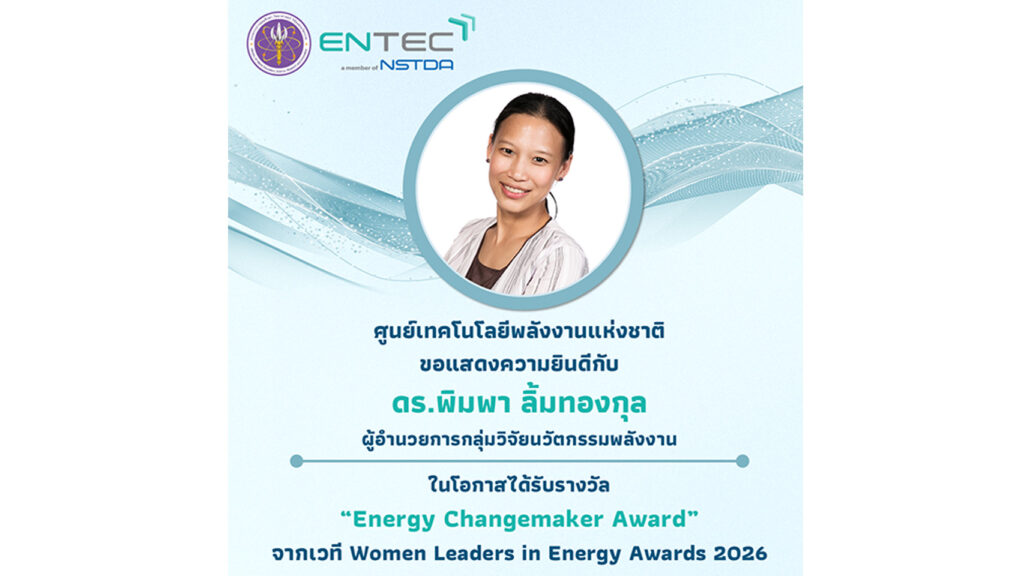 The National Energy Technology Center (ENTEC), NSTDA would like to congratulate Dr. Pimpa Limthongkul, Director of the Energy Innovation Research Group at ENTEC and President of the Thailand Energy Storage Technology Association (TESTA), on receiving the Energy Changemaker Award at the Women Leaders in Energy Awards 2026.