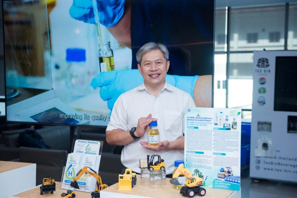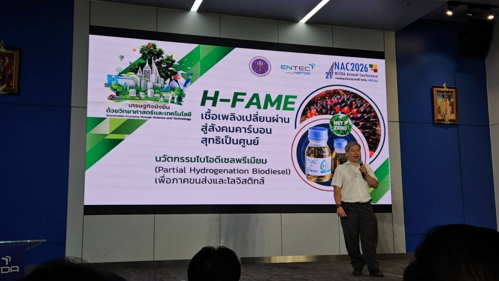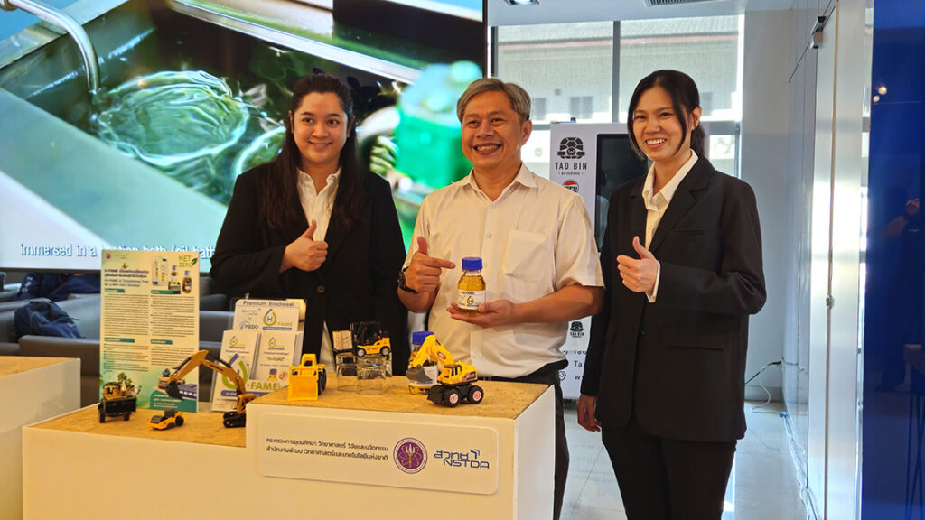 On this occasion, the National Energy Technology Center (ENTEC), NSTDA, participated in the press conference and presented its highlighted innovation, “H-FAME Premium Biodiesel for Low-Carbon Transport,” a biofuel innovation, developed by ENTEC in collaboration with international and public-sector partners. H-FAME can be used as a drop-in fuel replacement for conventional diesel fuel in heavy-duty trucks and diesel-powered machinery without engine modification.