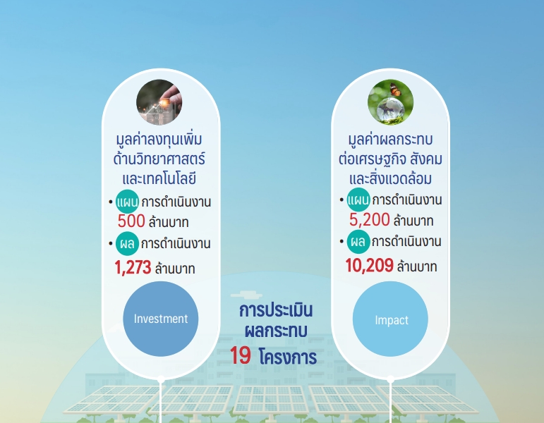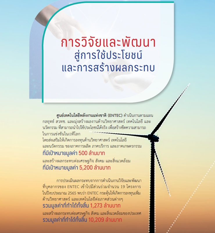 การประเมินผลกระทบจากการดำเนินงานวิจัยและพัฒนาที่บุคลากรของ ENTEC เข้าไปมีส่วนร่วมจำนวน19 โครงการในปีงบประมาณ 2565 พบว่า ENTEC กระตุ้นให้เกิดการลงทุนเพิ่มด้านวิทยาศาสตร์ และเทคโนโลยีต่อภาคส่วนต่างๆ รวมมูลค่าทั้งสิ้น 1,273 ล้านบาท และสร้างผลกระทบต่อเศรษฐกิจ สังคม และสิ่งแวดล้อมของประเทศรวมมูลค่าทั้งสิ้น 10,209 ล้านบาท