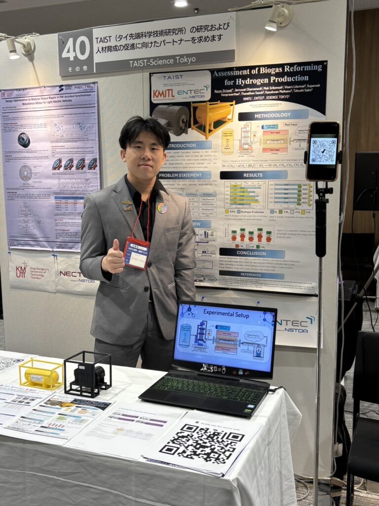 The fair was honored by the presence of distinguished executives, including Dr. Somboon Sahasithiwat, Executive Vice President of NSTDA, Ms. Sirinporn Deawtrakool, Deputy Executive Director of the National Research Council of Thailand (NRCT), and Assoc. Prof. Dr. Preecha Karin, representing the academic collaboration under the TAIST program. Their visit provided motivation and support for Thai researchers showcasing their work on the international stage. ENTEC nominated Mr. Nayos Sirisoot, Research Assistant of the Renewable Energy and Energy Efficiency Research Team, who was selected as one of only seven representatives to present his research among TAIST–Science Tokyo participants. This opportunity marks a significant milestone, reflecting the potential of Thai early-career researchers to contribute to global scientific dialogue.