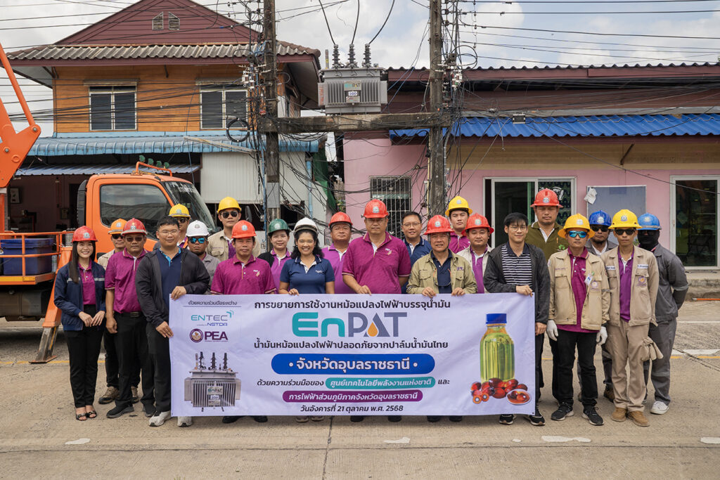 On 21 October 2025, the National Energy Technology Center (ENTEC), National Science and Technology Development Agency (NSTDA), in collaboration with the Provincial Electricity Authority (PEA), advanced the expansion of “EnPAT,” a safe, Thai palm-oil-based transformer oil in Ubon Ratchathani. The EnPAT-filled transformer was installed in Hua Ruea Subdistrict, Mueang Ubon Ratchathani District, Ubon Ratchathani Province,
