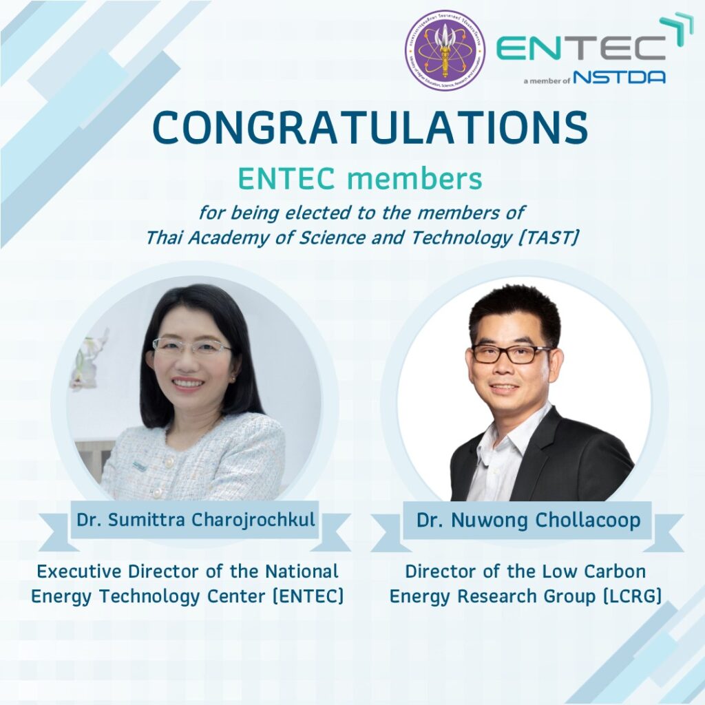 Congratulations to Dr. Sumittra Charojrochkul, Executive Director of the National Energy Technology Center (ENTEC), Dr. Nuwong Chollacoop, Director of the Low Carbon Energy Research Group, and Dr. Amornrat Limmanee, Team Leader of the Solar Photovoltaic Technology Research Team, who have been selected as Regular Members, as well as Dr. Boonyawan Yoosuk, Team Leader of the