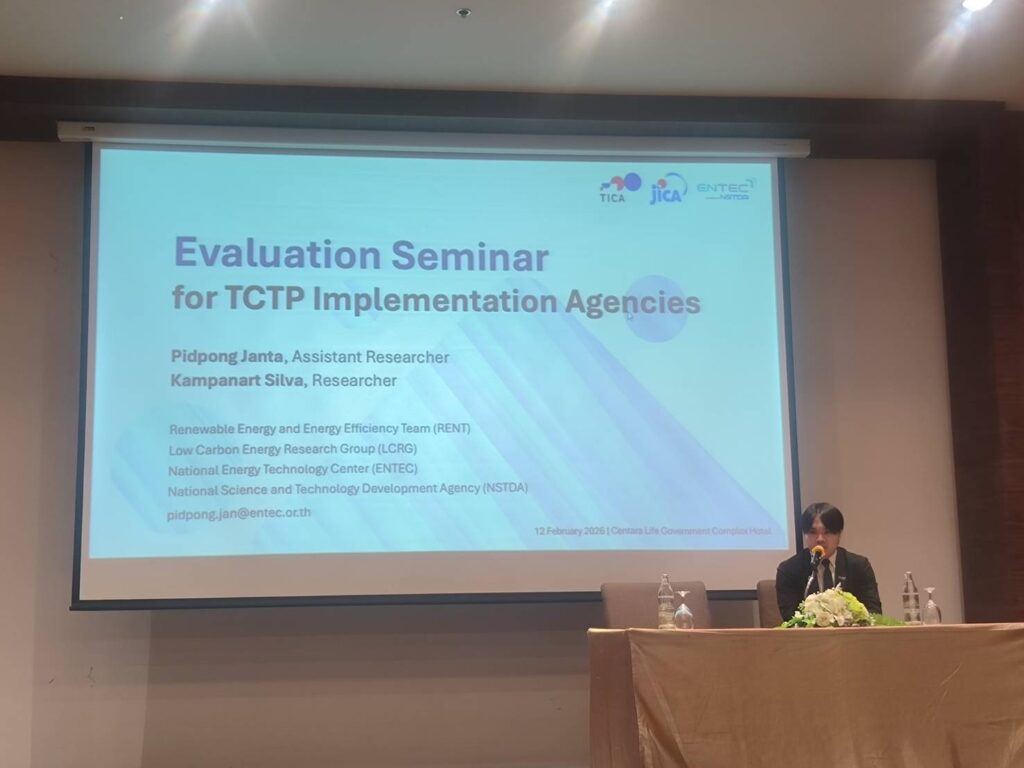 ระหว่างวันที่ 12-13 กุมภาพันธ์ 2569 ณ โรงแรมเซ็นทารา ไลฟ์ ศูนย์ราชการและคอนเวนชันเซ็นเตอร์ แจ้งวัฒนะ ดร.กัมปนาท ซิลวา นักวิจัย ทีมพลังงานทดแทนและประสิทธิภาพพลังงาน กลุ่มวิจัยพลังงานคาร์บอนต่ำ ศูนย์เทคโนโลยีพลังงานแห่งชาติ พร้อมด้วยนายพิชญ์พงษ์ จันทา ผู้ช่วยวิจัย ในทีมวิจัยฯ ได้เข้าร่วมการประชุมสัมมนา Evaluation Seminar for TCTP Implementation Agencies ซึ่งจัดโดย กรมความร่วมมือระหว่างประเทศ ดร.กัมปนาท ซิลวา และนายพิชญ์พงษ์ จันทา ได้รับเชิญในฐานะหนึ่งในหน่วยงานผู้ปฏิบัติที่ได้รับคัดเลือกให้แบ่งปันแนวทางการออกแบบแนวทางการฝึกอบรม Third Country Training Programme และแนวทางการเปิดรับฟังความเห็นจากผู้เข้าร่วม ซึ่งจากการนำเสนอโดยนายพิชญ์พงษ์ จันทา แนวทางการฝึกอบรม Third Country Training Programme และแนวทางการเปิดรับฟังความเห็น ได้ให้ความสำคัญกับการการอภิปรายแบบโต๊ะกลม (roundtable discussion) และการแลกเปลี่ยนแนวทางการดำเนินการต่อในอนาคต แนวทางดังกล่าวได้เป็นที่สนใจต่อผู้เข้าร่วมและ International Development Center of Japan